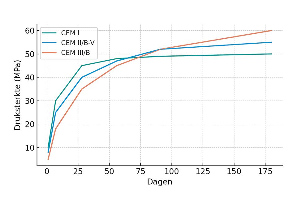 Beton is een materiaal dat zich in de tijd blijft ontwikkelen. Na het mengen van cement, zand, grind en water begint het verhardingsproces: de hydratatie van het cement. Deze reactie zorgt ervoor dat het beton in de eerste dagen snel in sterkte toeneemt. Maar het stopt daar niet. Ook na de klassieke 28 dagen, het standaardmoment waarop de druksterkte wordt bepaald, blijft beton, weliswaar steeds langzamer, sterker worden.