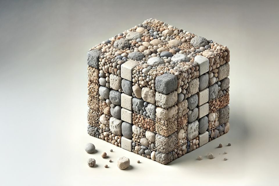 Verse betonspecie bestaat grofweg uit toeslagmaterialen en cementlijm (cement en water). Het toeslagmateriaal, meestal zand en grind, neemt met gebruikelijk ruim 70% veruit het grootste volume in. De ruimte die overblijft tussen de zand- en grindkorrels moet volledig worden opgevuld met cementlijm, omdat holle ruimtes nadelig zijn voor de druksterkte en de levensduur. Hoe minder holle ruimtes, hoe minder cementlijm er nodig is. De korrelgrootteverdeling van het toeslagmateriaal moet dus zodanig zijn dat de ruimtes tussen de grootste korrels worden opgevuld door kleinere korrels en de daarbij ontstane ruimtes weer door nog kleinere korrels, net zo lang totdat er alleen nog ruimtes zijn tussen de allerkleinste korrels toeslagmateriaal die worden opgevuld door cement en water. Het principe wordt tweedimensionaal weergegeven in figuur 1.