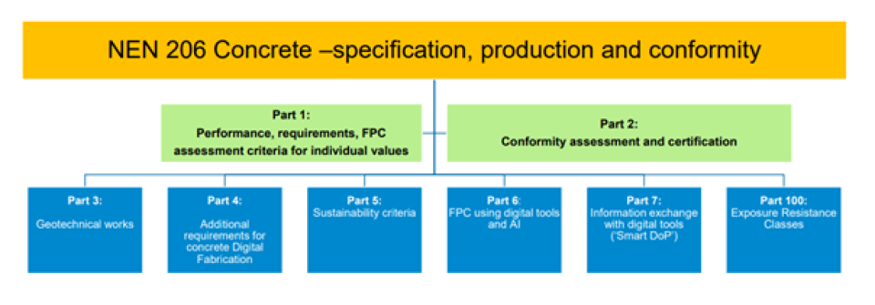 Op het gebied van betonregelgeving staan er meer veranderingen op stapel. Zo is de verwachting dat de EN 206 wordt opgesplitst in twee of drie afzonderlijke delen, en later misschien nog wel meer (zie figuur). Ook hiervoor is inbreng van uit Nederland nodig.