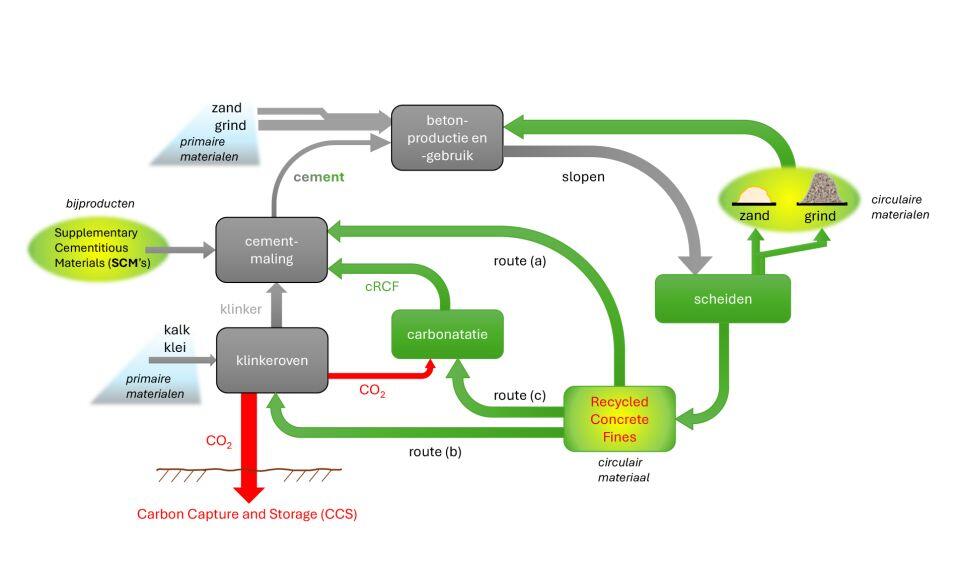 We beginnen daarbij met het kijken naar de hele cirkel van produceren en slopen van beton. We zullen zien dat de fijnste fractie bij innovatieve recycling, de recycled concrete fines – we leggen later uit wat dit is – via drie verschillende routes weer in het beton kunnen worden teruggebracht. Een van die routes is door deze fijne fractie te carbonateren. Dat is niet alleen interessant voor het opwerken van cementsteen, maar ook voor het verder verlagen van de CO2-voetafdruk van cement. In deze Betoniek staan we daar ook bij stil. Tot slot gaan we kort in op de nieuwe cementnorm die het gebruiken van circulair cementsteen mogelijk maakt, en geven we aan wat het voor de praktijk betekent om met het nieuwe cement aan de gang te gaan. Daarmee is in principe de cirkel naar circulair beton, en specifiek circulair cementsteen, rond. Om echter zeker te weten dat we niets vergeten, beginnen we met die cirkel eens expliciet te maken.