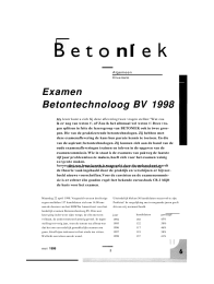 nlAlgemeenkExamenExamenBetontechnoloog BV 1998lezer kunt u zich bij deze aflevering twee vragen stellen:'Wat zouik er nog van weten 1', of'Zou ik het allemaal wel weten 1'. Deze vra-gen splitsen in feite de lezersgroep van BETONlEK ook in twee groe-pen. Die van de praktizerende betontechnologen. Zij hebben metdeze examenaflevering de kans hun parate kennis te toetsen. En dievan de aspirant; betontechnologen. Zij kunnen zich aan de hand van deoude examenafleveringen trainen en inleven in de opgaven van deexamencommissie.Wie in staat is de examens van pakweg de laatstevijf jaar probleemlooste maken, hoeft zich voor het examen weinigzorgente maken.De praktizerend betontechnoloog zal echter tot de ontdekkingdat een hoop kennis is weggezakt.Aan de andere kant wordtde theorie vaak ingehaald door de praktijk en verschijnen er bijvoor-beeld nieuwe voorschriften.Voor de cursisten en de examencommis-sie is er echter één gouden regel: het bekende cursusboek CB-I blijftde basis voor het examen.Maandag 22 april 1998. Vergezeld van een druilerigeregen meldden 137 kandidaten zich om 14.00 uuraan de deuren van het SOMTin Amersfoort voor hetlandelijk examen Betontechnoloog BV. Drie uurlater ging ieder weer zijns weegs; de één met eenvoldaan, de ander meteen katterig gevoel. In tegen-stelling tot vorig jaar, toen de teneur na afloop wasdat het om een redelijk gemakkelijk examen zougaan, bleefbijna iedereen tot het einde toe zitten.Wellicht een teken aan de wand.Uiteindelijk bleken 56 kandidaten succesvol te zijn.Proficiat! In vergelijking met voorgaande jaren geeftdit een vrij normaal beeld.jaar kandidaten geslaagd1994 192 45%1995 132 50%1996 117 46%1997 119 38%1998 137 41%mei 1998Hieronder volgt een weergave van het exameninclusiefde antwoorden en soms een toelichtingvan de examencommissie.Het examen bevatte 27 meerkeuze- en 8 'open vra-gen'. Met de meerkeuzevragen waren maximaal 30punten te verdienen en met de open vragen maxi-maal 70. In totaal dus 100 Punten.Zoals gewoonlijk werd bij aanvang van het exameneen set 'Algemene gegevens' uitgereikt. Hierinwaren de benodigde tabellen afgedrukt metgege-vens overwaterbehoefte, milieuklassen. hoeveelhe-den fijn materiaal, relatie goedkeurkansjondeugde-lijkheidspercentage, normsterkte cement, keurings-criterium, gewogen rijpheid en de grenslijnen voorde diverse korrelgroepen.Mocht u tijdens de uitwerking van de vragen éénvan deze gegevens nodig hebben, dan kunt u dezeterugvinden in het boek 'Betontechnologie', negen-de geheel herziene druk, 1995.Deel A: Meerkeuzevragenor degenen die de meerkeuzevragen willen oefe-n, zijn de antwoorden en essentiële uitwerkingengenomen op blz. 13Vraag IHoogovencement en portlandvliegascement heb-ben met elkaar gemeen datA beide portlandcementklinker en een reststofbevatten.B bij de productie minder bindtijdregelaar wordttoegevoegd dan bij portlandcement wordt toege-voegd.C een langere nabehandeling nodig is dan bijeenportlandcement van dezelfde sterkteklasse.D zowel de gebruikte slak als de vliegas pnzzolaneeigenschappen hebben.Vraag 2De belangrijkste reden voor het maken van eenzeefanalyse van toeslagmateriaal is omA de fijnheidmodulus te kunnen bepalen.B te bepalen welk volume de verschillende korrelsinnemen.Bet 0 n i e k mei 19982C te bepalen hoe zwaar de korrels zijn.D vast te stellen in hoeverre een Fullerkromme kanworden benaderd.Vraag 3Het begrip permeabiliteit van beton betrek-king opA de hoeveelheid toevalligeB de porositeit deC het gemak waarmeewater zich door hetporiënsysteem kan bewegen.Dhet poriënvolumevan de cementsteen.Vraag 4Cement met een hoge bestandheid tegen, sulfatenbevatA meer dan 25%vliegas.B meer dan 65%C meer dan 65% slak.D minder dan 10%C3A.Vraag 5Voor het globaal bepalen van de volumieke massavan een toeslagmateriaal wordt gebruik gemaaktvan het 81 meetvat. Het meetvat wordtgevuld met15835 g nat toeslagmateriaal (vochtgehalte 2,1 %)en afgevuld met 1642 g water.De Ps van het toeslagmateriaal bedraagt:A 2420 kg/m3B 2500 kg/m3C 2570 kg/m3D 2650 kg/m3Vraag 6Bij transport van betonspecie vanafeen natte cen-trale naar een bouwwerk moet de trommel op detruckmixerA niet draaien omdat de specie al op de centralegemengd is.B niet draaien om het morsen van specie tevoorkomen.C langzaam draaien om ontmenging te voorkomen.D langzaam draaien uit oogpunt van verkeersveilig-heid.Vraag 7Gebruik van een superplastificeerder bij een meng-selontwerp heeft een hogere sterkte tot gevolg tenopzichtevan het rnengsel zonder superplastificeer-der indienA desuperplastificeerder geen vertragende neven-werking heeft.B de water-cementfactoren gelijk zijn.e bet cementgehalte en de consistentie gelijk zijn.D het watergehalte en de consistentie gelijk zijn.Vraag 8In een bepaalde betonsamenstellingwilt u ter ver-betering van destabiliteit poederkoolvliegas con-form NEN-EN 450 gebruiken ter aanvulling van defijnste fractie toeslagmateriaal. Dat magA als de juiste k-waardewordt aangehouden.B als de waterbehoefte niet wordt beïnvloed.e in alle gevallen.D nooit.Vraag 9Een betonsamensteIling voor een werk in milieu-klasse 1 (graderingsgebied A-B) bevat per m-' 263 kgRen 110 kg poederkoolvliegas. Volgensde VET 1995 betekent een van 0,2 voorpoederkoolvliegas dat het bindmiddelgehalte vande betonspecie gelijk is aan:A 263 kg.B 280 kg.e 285 kg.D 373 kg.Vraag 10De verdichtingsmaat isA alleen geschikt voor betonspecies met enormegrote samenhang.B een dynamische meetmethode omdat de beton-specie door middel van trillen wordt verdicht.e een meetmethode die bepalend is bij twijfel overde consistentie in consistentiegebied 2 en 3.D een statische meetmethode omdat alleen dezwaartekracht van invloed is.Bet 0 n jek mei 19983Vraag 11Wanneer voor een bouwwerk beton in sterkteklasseB 35 wordt gevraagd, betekent dit datA 5%van de druksterkte resultaten kleiner magzijn dan 35 Njmm'.B 95% Van de steekproeven wordt goedgekeurd.e de u-waarde van de geleverde betonspecie1,64 is.D het consumentenrisico 95% is.Vraag 12Microscheuren in beton kunnen worden