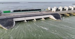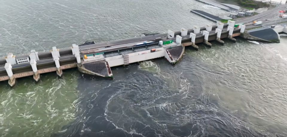 De nieuwe spuisluizen van de Afsluitdijk bij Den Oever zijn deze week getest. Tijdens de zogeheten vervaltesten stroomde overtollig water van het IJsselmeer naar de Waddenzee, onder de A7 door.